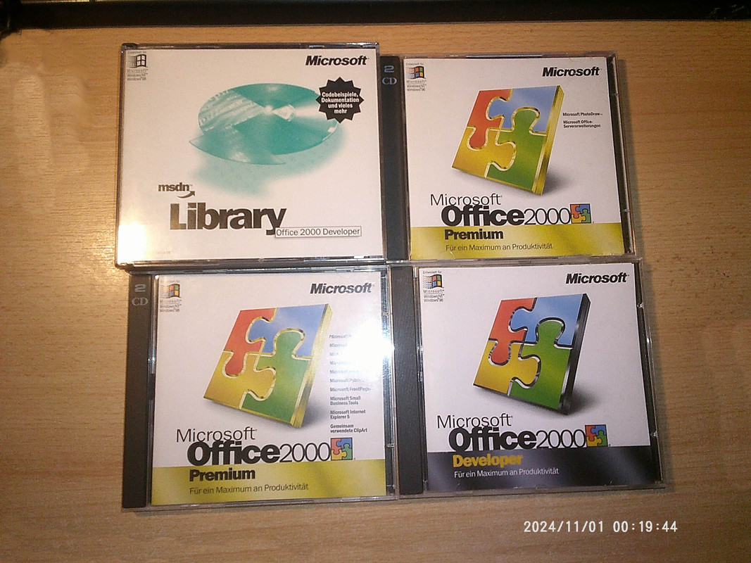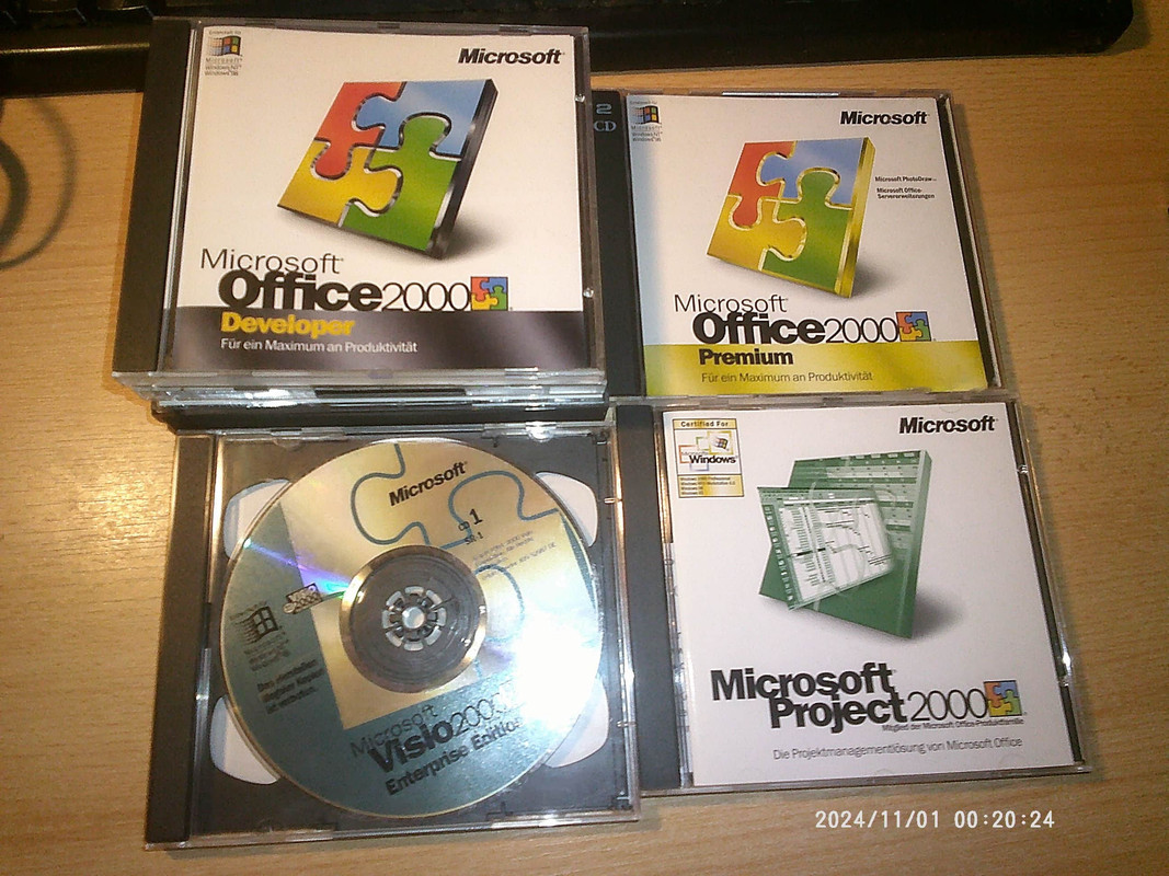 Про Office 2000 Standard и Professional Edition я ничего не могу сказать, хоть у меня есть Standard и Professional, у меня есть ещё Microsoft Office 2000 Developer Edition, эта программа для разработки ПО под Microsoft Office 2000, и полная версия аж на 11 CD дисках. У меня установлены все программы, но фоторедактор Microsoft PhotoDraw 2000 почему-то в Windows XP вылетает. Вот